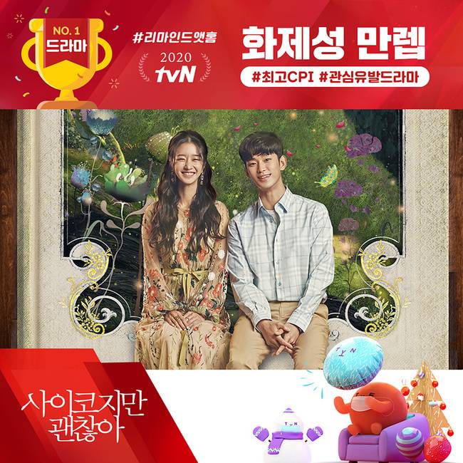 먼저 김수현, 서예지 주연의 '사이코지만 괜찮아'가 참신한 연출과 독특한 소재, 배우들의 호연으로 독보적인 화제를 모으며 콘텐츠영향력지수(CPI)에서 드라마 부문 1위에 올랐다. '사이코지만 괜찮아'는 3주 연속 CPI 1위를 달성하며 콘텐츠가 가진 영향력과 화제성을 증명했다. 예능에서는 '삼시세끼 어촌편5'이 8주 연속 tvN 콘텐츠 가운데 CPI 1위를 차지했다.