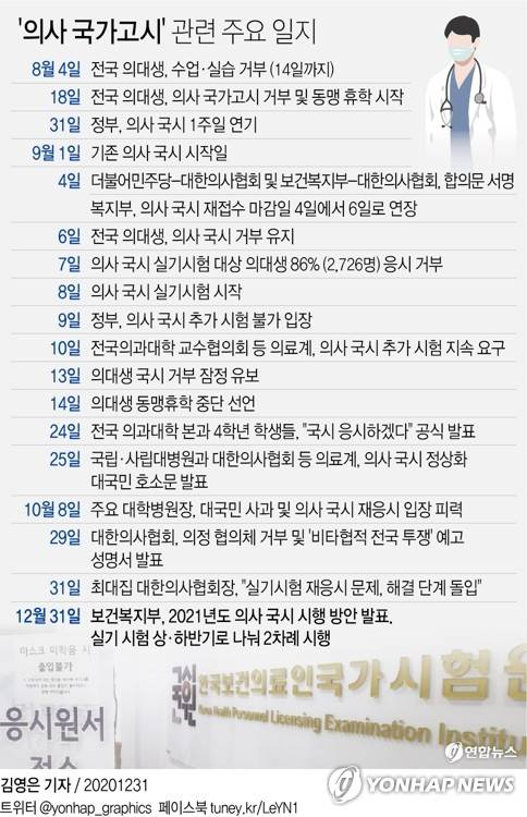(서울=연합뉴스) 김예나 기자 = 정부가 내년 하반기로 예정된 의사 국가고시(국시) 실기 시험을 상·하반기로 나눠 2차례로 치르기로 했다.