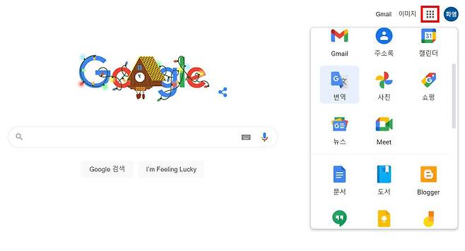 구글 번역은 가장 많이 사용하는 영어와 일본어, 중국어뿐만 아니라 108개국 언어를 지원한다. 구글 번역으로 한글을 원하는 언어로 번역하자. 물론 반대도 가능하다. 외국어를 한글로 번역할 수도 있다. 먼저 구글 홈페이지 첫 화면에서 프로필 이미지 왼쪽에 있는 ‘구글 앱’ 버튼을 누른 다음 ‘번역’을 누른다.