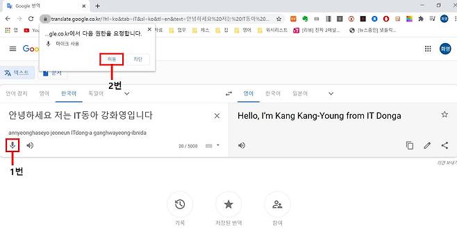 구글 음성 인식 기능을 이용하면 글자 입력이 필요 없다. 다만 글자를 입력할 때와 달리 먼저 어떤 언어로 말 할 건지 구글 번역에게 먼저 알려야 한다. 그 다음 마이크 사용에 대한 권한 요청을 허용한다. ‘마이크’ 버튼을 누르면 의사를 묻는 대화상자가 나타난다. ‘허용’ 버튼을 누른다. ‘영어’를 선택한 뒤 한국어로 말한다. 오른쪽 화면에서 구글 번역이 한국어로 말한 내용을 영문으로 번역한 결과를 볼 수 있다.