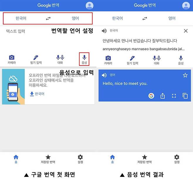 안드로이드 스마트폰은 구글 플레이, 애플 아이폰은 앱스토어에서 구글 번역 앱을 내려받는다. 구글 번역 앱 첫 화면에서 왼쪽과 오른쪽 언어를 누르면 번역할 언어를 바꿀 수 있다. 영어로 번역하려면 오른쪽 메뉴에서 ‘영어’를 선택한 다음 입력문을 타이핑하거나, 마이크 모양 아이콘인 ‘음성’을 눌러서 음성으로 입력한다.