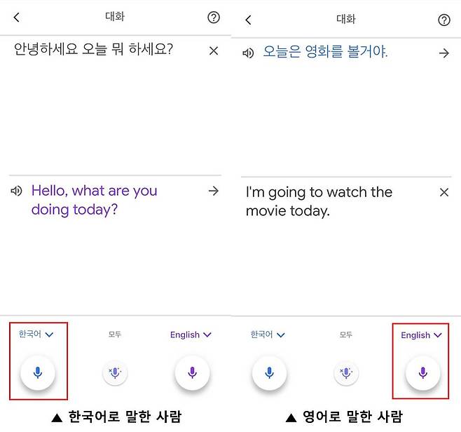 컴퓨터 버전과 가장 다른점은 실시간 대화를 번역한다는 점이다. 먼저 구글 번역 앱 첫 화면에서 ‘대화’를 누른다. ‘스피커’ 버튼을 누르면 원어를 음성으로 들을 수 있다. 대화하기 전 ‘양방향 마이크’ 버튼을 터치한 다음 한국어와 영어로 대화를 하면 한국어는 영어로, 영어는 한국어로 남녀 음성으로 번역한다.