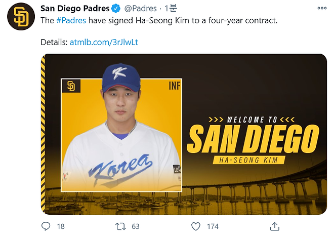 이어 샌디에이고는 이날 오전 구단 공식 SNS에 김하성의 사진을 올리며 "김하성은 구단 첫 KBO리그 출신 선수"라고 소개했다.