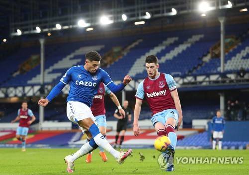 epa08914557 Ben Godfrey (L) of Everton in action against Declan Rice (R) of West Ham during the English Premier League soccer match between Everton FC and West Ham United in Liverpool, Britain, 01 January 2021. EPA/Peter Byrne / POOL EDITORIAL USE ONLY. No use with unauthorized audio, video, data, fixture lists, club/league logos or 'live' services. Online in-match use limited to 120 images, no video emulation. No use in betting, games or single club/league/player publications.
