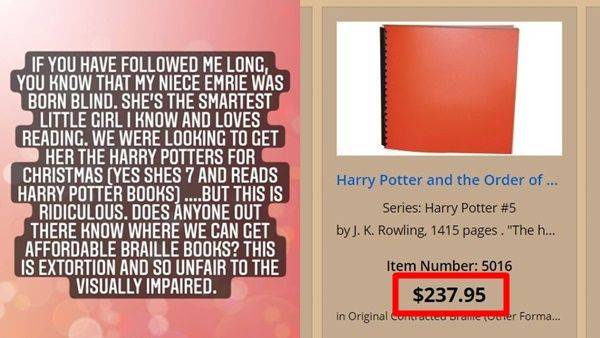 고모 수터 씨도 자신의 SNS에 조카가 읽고 싶어 하는 책을 선뜻 사주지 못하는 고충을 토로하면서 "시각장애인 자녀를 둔 가정이 책 가격 때문에 망설이는 일은 없어야 한다"고 주장했습니다. "지역 도서관 여러 곳에 방문했지만 어디에서도 점자로 된 '해리포터' 시리즈를 찾을 수 없었다"고도 덧붙였습니다.