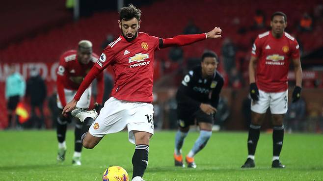 맨유는 영국 맨체스터의 올드 트래퍼드에서 열린 애스턴 빌라와 EPL 17라운드 홈 경기에서 앙토니 마르시알의 선제골과 브루누 페르난데스의 페널티킥 결승 골에 힘입어 2대 1로 이겼습니다.