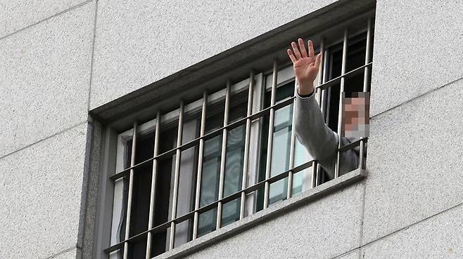 3일 오후 코로나19 확진자가 다수 발생 중인 서울 송파구 동부구치소에서 한 수용자가 취재진을 향해 손을 흔들고 있다.