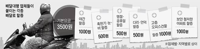 자영업자들의 불만은 최근 신설되는 ‘할증' 때문이다. 지난달 30일 한 배달대행 업체는 서울과 경기, 대전·충남 일부 지역에 ‘기상 할증 500’원을 신설했다. 눈비가 오면 500원씩 추가로 받겠다는 것이다. 이 밖에 업체에 따라 야간 할증, 언덕 할증, 보안 철저한 아파트 할증, 고층건물 할증, 명절·공휴일 할증, 스포츠경기 할증, 라이더(배달원) 인원 적음 할증 등 온갖 할증이 생기고 있다는 게 자영업자들의 얘기다.