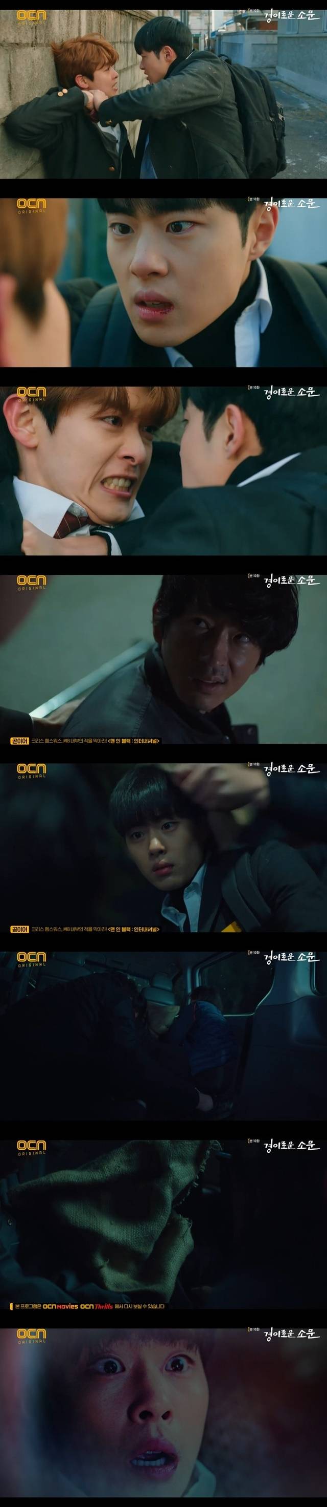 신혁우는 부친 신명휘가 유력한 대선후보가 되자 소문을 인적이 드문 곳에서 폭행했고, 소문은 신혁우의 주먹을 막으며 일부러 능력을 숨기고 있음을 드러냈다. 이후 소문은 길에서 차에 치일 뻔한 남자를 구했지만 그는 앞서 지청신이 포섭한 다른 악귀였고, 다음 순간 소문이 납치되며 위기를 맞았다. (사진=OCN ‘경이로운 소문’ 캡처)