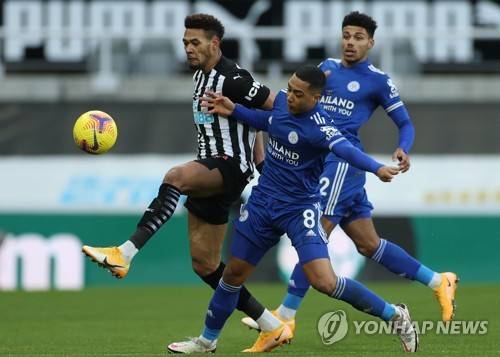 epa08916812 Joelinton (L) of Newcastle in action against Youri Tielemans (C) of Leicester during the English Premier League soccer match between Newcastle United and Leicester City in Newcastle, Britain, 03 January 2021. EPA/Lee Smith / POOL EDITORIAL USE ONLY. No use with unauthorized audio, video, data, fixture lists, club/league logos or 'live' services. Online in-match use limited to 120 images, no video emulation. No use in betting, games or single club/league/player publications.
