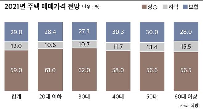 4일 부동산 정보업체 직방은 애플리케이션 이용자 3230명을 대상으로 설문조사를 진행한 결과, 전체 응답자 중 59%가 2021년 주택 매매가격이 ‘상승’할 것으로 예상했다고 밝혔다. ‘하락’은 29%, 보합은 12%에 그쳤다.