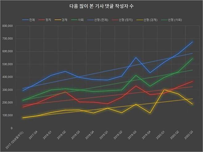 특히, 이런 경향은 점점 더 강화되고 있다. 기사당 평균 댓글 수는 2017년 다음이 네이버에 비해 1.85배 많았는데, 2018년 2.35배, 2019년 2.73배, 2020년 3.12배로 격차가 점점 커졌다. 특히, 사회 관련 뉴스의 경우 2017년엔 네이버 기사당 평균 댓글 수가 다음보다 오히려 많았지만, 2020년엔 다음이 네이버보다 2.16배 많았다. 정치 관련 뉴스도 사회 분야와 비슷한 증가폭을 보였는데, 정치·사회 분야의 댓글 증가가 전체의 변화를 이끌었다고 해석할 수 있다.