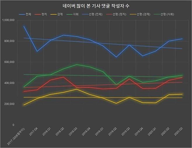 위 그래프는 네이버와 다음 뉴스에서 매 분기별 한 번이라도 댓글을 단 사람의 숫자를 표시한 것이다. 네이버 뉴스 쪽은 전반적으로 감소 추세인데, 다음 쪽은 증가 추세다. 정치, 경제, 사회 분야 모두 마찬가지다.