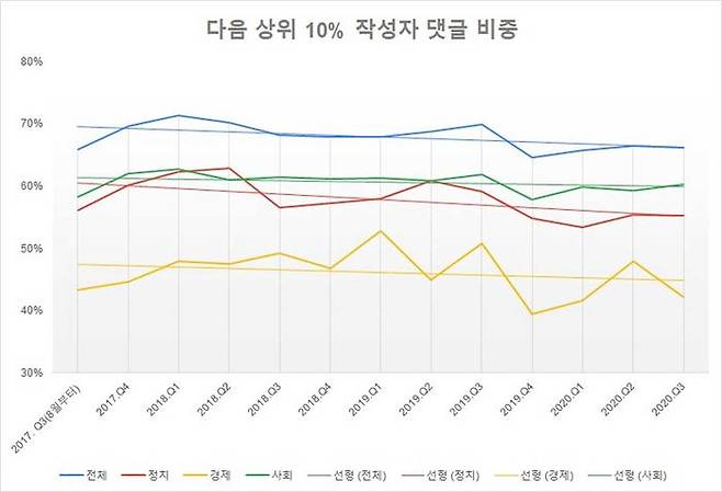 다만, 긍정적인 건 상위 10%, 이른바 헤비 댓글러가 작성한 댓글이 전체 댓글에서 차지하는 비중이 다소 감소하고 있다는 점이다. 위 그래프는 분기별로 상위 10% 헤비 댓글러 작성 댓글이 전체 댓글에서 차지하는 비중을 표시한 것으로, 점선은 추세선을 의미한다. 네이버 쪽이 다음에 비해 상위 10%의 댓글 비중이 빠르게 감소하고 있는 것을 확인할 수 있다. 특히, 네이버 쪽은 댓글 작성자 수의 감소세에도 불구하고 상위 10%의 댓글 비중도 감소하면서 쏠림 현상이 다음 쪽에 비해 빠르게 개선되고 있다고 할 수 있다.