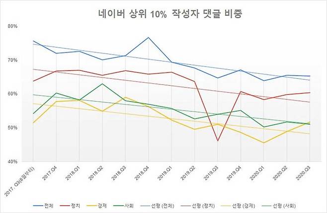 위 그래프는 댓글 작성수 기준 상위 10%의 작성자가 단 댓글이 전체 댓글에서 차지하는 비중을 표시한 것이다. 2019년보다 나아졌다고 하지만, 2020년 비중은 네이버와 다음 모두 70%가 넘는다. 상위 10%의 숫자는 네이버와 다음 각각 13.6만 명과 10.3만 명이다. 10대 이상 우리 인구의 0.3%도 안 되는 사람이 댓글 대부분을 작성하고 있는 셈이다.