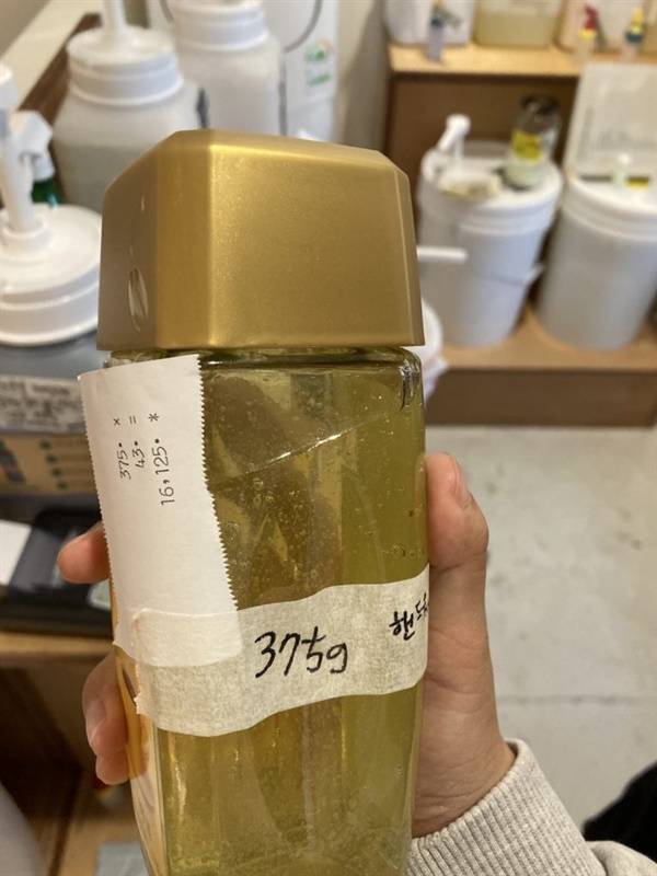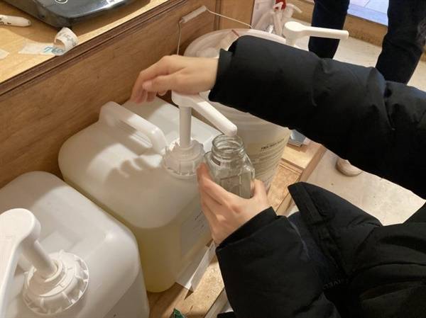 | ▲ 사무실에서 사용할 핸드워시를 다마신 커피유리병에 담았다. |