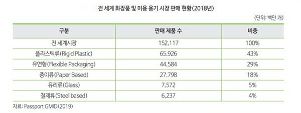 | ▲ 전 세계 화장품 및 미용 용기 시장 판매현황 플라스틱류가 43%에 이른다 |