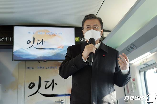 (제천=뉴스1) 박정호 기자 = 문재인 대통령이 4일 강원도 원주역에서 열린 저탄소·친환경 고속열차 KTX-이음(EMU-260) 개통식을 마친 뒤 열차를 타고 제천으로 이동, 마무리 발언하고 있다. 2021.1.4/뉴스1