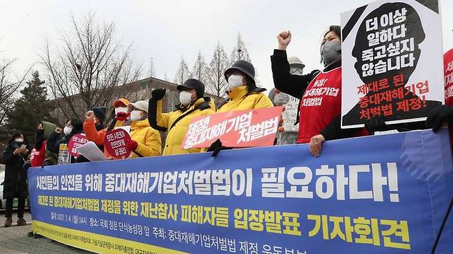 세월호 참사와 가습기 살균제 참사 등 재난·참사 피해자들은 오늘(4일) 여의도 국회 앞에서 기자회견을 열고 "제대로 된 중대재해기업처벌법을 제정하라"고 촉구했습니다.