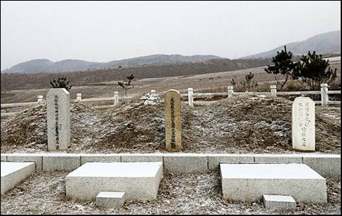 | ▲ 대종교 3인의 묘- 독립이란 민족의 대의(大義)를 위해 삶을 바쳤던 3인의 묘 앞에서 우리 일행들이 제사를 지내고 있다. |