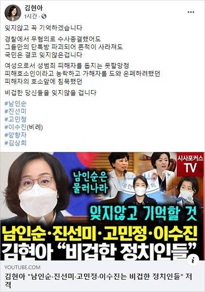 김 비대위원은 오늘(4일) 자신의 페이스북에 남인순, 진선미, 고민정, 이수진, 양향자, 김상희 의원의 이름을 나열하면서 "비겁한 당신들을 잊지 않을 겁니다"라고 말했습니다.