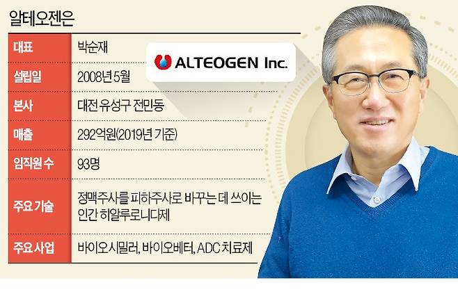박순재 알테오젠 대표는 4일 “피하주사 형태로 제품을 개선한 바이오시밀러(바이오의약품 복제약)를 내놓겠다”며 이같이 말했다. 알테오젠은 정맥주사를 피하주사(SC)로 바꿀 수 있는 인간 히알루로니다제 기술을 보유하고 있다. 이 기술을 갖춘 기업은 세계에서 알테오젠을 포함해 두 곳뿐이다. 알테오젠은 인간 히알루로니다제로 지난해에만 총 6조3000억원에 달하는 두 건의 기술수출 계약을 했다.