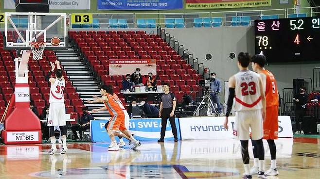 종료 직전 전자랜드 전현우의 3점 슛 시도가 무위에 그치며 경기는 결국 현대모비스의 승리로 막을 내렸습니다.