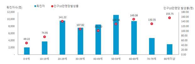 - 연령대별 인구 10만 명 당 사망자 수는 80세 이상이 25.59명으로 가장 높았고, 70대 6.93명, 60대 1.62명, 50대 0.35명, 40대 0.08명, 30대 0.04명이다.