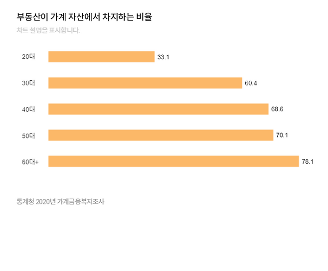 통계청의 가계금융복지조사에 따르면 지난해 60세 이상 고령자 자산 중 부동산 비중은 78.1%에 달해 전 연령대 중 가장 높고 저축 비중은 15.5%로 전 세대 중 가장 낮았다. 쉽게 말해 현금 동원력이 가장 부족해, 집 하나 빼면 남는 게 없는 세대라는 뜻이다.