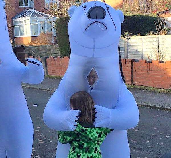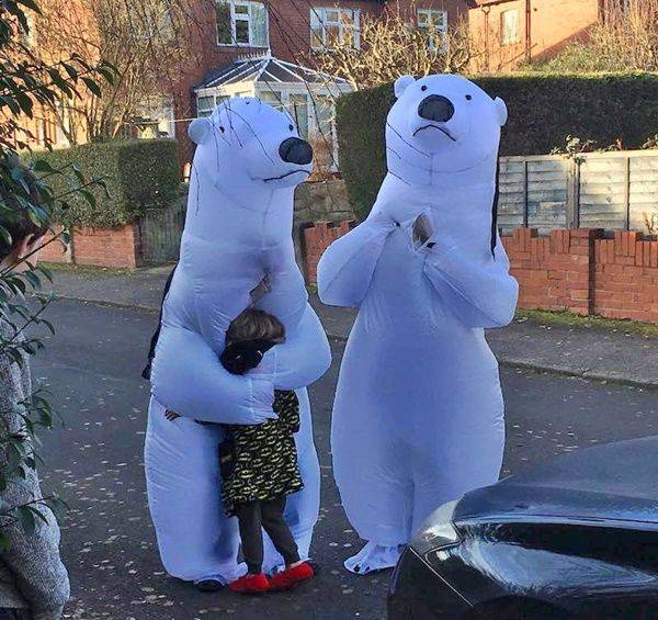크리스마스날 월쇼 부부는 두 마리 북극곰으로 모습을 바꾸고 아들 닐 씨의 동네로 향했습니다. 이 사실을 미리 전해 들은 닐 씨는 "집 앞에 북극곰이 나타났다"며 호들갑을 떨었지만, 호기심에 집 밖으로 나간 아이들은 거대한 북극곰들과 맞닥뜨리곤 경악했습니다. 막내인 6살 퀸은 이들이 진짜 곰인 줄 알고 집 안으로 도망쳐 들어오기도 했습니다.