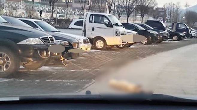 현재 사회관계망서비스(SNS)에는 개가 차에 묶여 쓰러져 있는 사진이 공개돼 시민들의 공분을 사고 있습니다.