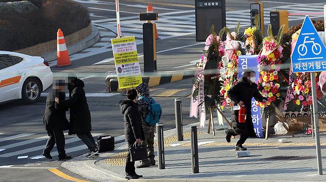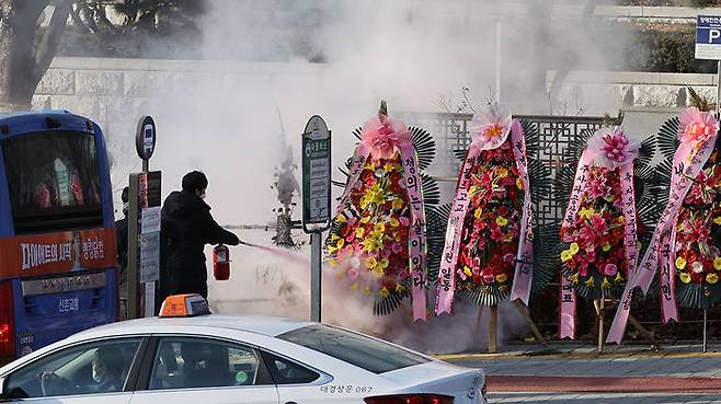 대검 관계자들이 곧바로 진화에 나섰으나 화환 4개가 불에 탔습니다.