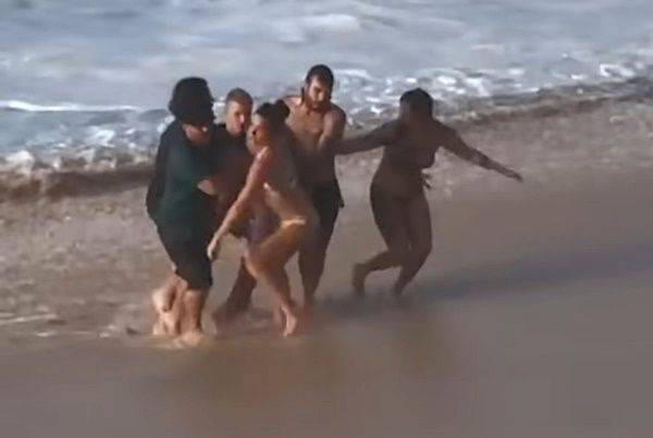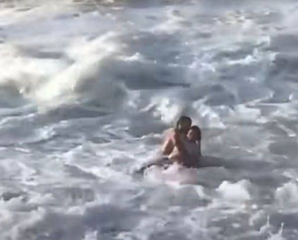 이때 한 남성이 재빠르게 나타나 바닷속으로 뛰어들었습니다. 파도를 헤치고 여성을 붙잡는 데 성공한 남성은 능숙하게 파도에 몸을 싣고 뭍으로 빠져나왔습니다. 커다란 파도가 한 번 더 이들을 덮치려는 것을 눈치채고는 자신의 몸으로 파도를 막아 여성을 보호하기도 했습니다.