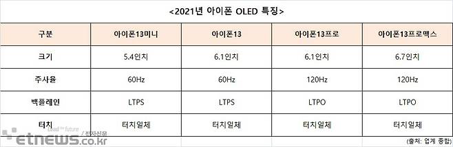 LG디스플레이는 아이폰13 일반형에 들어갈 OLED 패널을 주로 공급할 전망이다. LTPO, 터치일체 패널 등을 양산한 경험이 삼성디스플레이보다 적어서다. LG디스플레이는 6.1인치 LTPS 패널을 주력 납품할 전망이며, LTPO 패널은 일부에 그칠 수 있다.