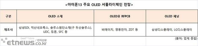 애플이 아이폰13 시리즈(가칭)에 삼성디스플레이와 LG디스플레이가 만드는 플렉시블 유기발광다이오드(OLED) 디스플레이 탑재를 추진하면서 국내 소재부품 업계에 미칠 영향에 관심이 쏠리고 있다. 아이폰은 연간 약 2억대가 판매되는 인기 스마트폰이다. 아이폰 채택은 곧 소재부품 공급 업체에 성장 기회가 된다.