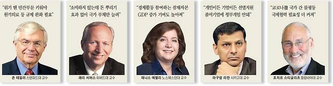 “대규모 정부 투자보다 민간 부문의 성장을 촉진시키는 게 팬데믹(대유행)으로 인한 경제 위기를 극복하는 해법이다.”(존 테일러 스탠퍼드대 교수) “코로나 사태로 평균 소득이 줄지 않았는데 모든 국민에게 똑같이 현금을 뿌리면 경제엔 독(毒)이 될 수 있다.”(래리 서머스 하버드대 교수)