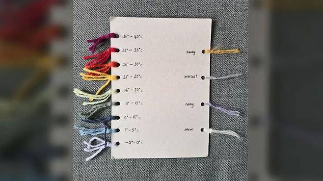 기온에 따라서 각각 다른 색을 정해 놓고 그 날 영국 기온에 해당하는 실로 뜨개질을 한 것인데요 붉은 빛깔이 좀 더 높은 기온을 뜻합니다.
