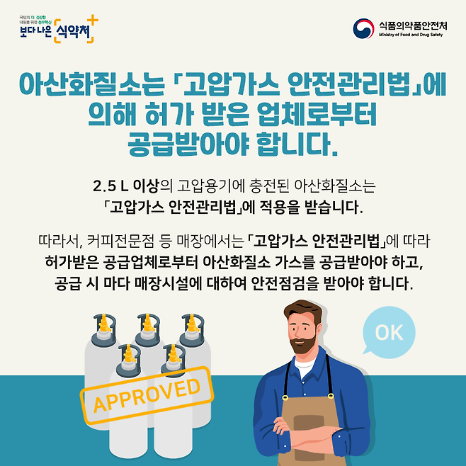 식품첨가물로 판매되는 아산화질소는 2.5L 이상의 고압금속제용기에 충전해서 유통해야 하고, 매장들은 '고압가스 안전관리법'에 따라 허가받은 공급업체에서 아산화질소 가스를 공급받아야 합니다.