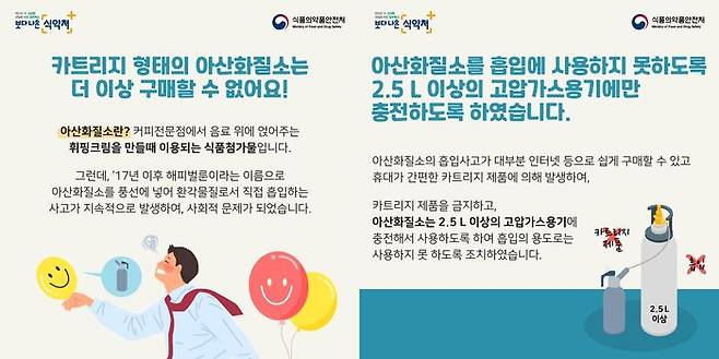 식품의약품안전처는 아산화질소를 소형용기(카트리지)에 넣어서 판매하거나 이를 사용하는 행위를 2021년 1월 1일부터 전면 금지한다고 밝혔습니다.