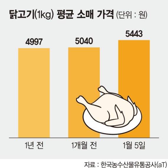 5일 한국농수산물유통공사(aT)에 따르면 이날 닭고기 1kg 평균 가격은 5443원을 기록했다. 1개월 전(5040원)보다는 8%, 1년 전(4997원)보다는 8.9% 오른 수치다.