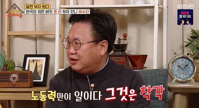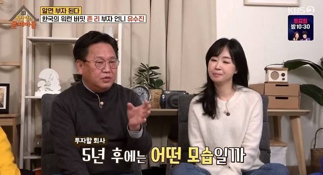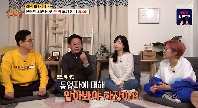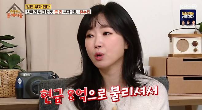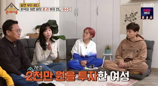 한편 이날 방송엔 자산관리사 유수진도 함께했다. ‘부자언니’로 불리며 인터넷 상에 투자 노하우를 전수 중인 유수진은 “우리 같은 사람들에게 보통 ‘계좌 까보라. 돈이 얼마나 있나’라고 묻는데 가진 것을 다 잃는다고 해도 지금처럼 자산을 불릴 지식 자산이 있다”라고 자신했다.