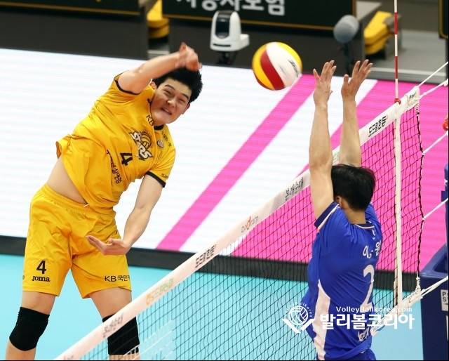 【발리볼코리아닷컴(의정부)=김경수 기자】 5일(화) 경기도 의정부시 의정부체육관에서 열린 프로배구 2020-2021 V리그 4라운드 남자부 KB손해보험 vs 삼성화재 의정부경기에서 KB손해보험 홍상혁의 공격을 삼성화재 이승원이 블로킹하고 있다. 2021. 1. 5.