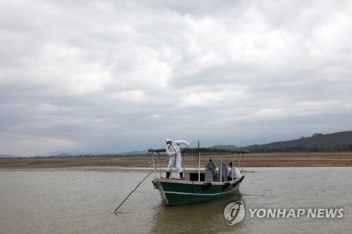 epa08920415 Wildlife officials search for dead birds that supposedly died due to Avian Influenza, at the Pong Dam reservoir lake which is a popular spot for migratory bird watching, at Nagrota Surian in Kangra, India, 05 January 2021. According to news reports, more than 2300 birds of different species including migratory birds have been found dead at Pong Lake since the last seven days. Preliminary results from the samples of Bar Headed Goose who migrate from Siberia and Mongolia have tested positive for the H5N1 virus. EPA/SANJAY BAID