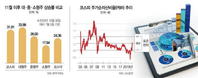 다만 코스피가 배당 기대감 등 연말 대형주를 중심으로 상승해온 만큼 저평가된 중·소형주와 가치주 등 상대적으로 덜 오른 종목이 이후 상승 랠리를 주도할 것이라는 전망에 힘이 실리고 있다.
