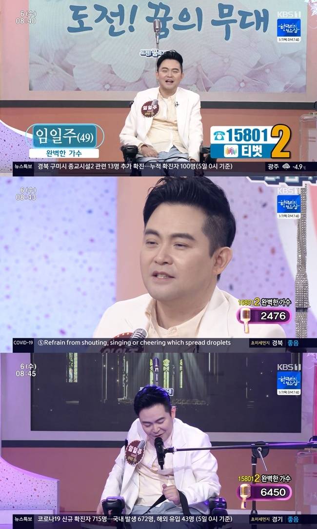 이날 임일주는 "저는 24살 때 군대 휴가 중 교통사고를 당해 경추 5, 6번 척수 손상으로 목 아래부터 사지가 다 마비됐다. 원래 꿈이 가수였는데 그날의 사고로 제 몸은 마비가 됐고 제 꿈은 산산조각이 났다"고 말문을 열었다.