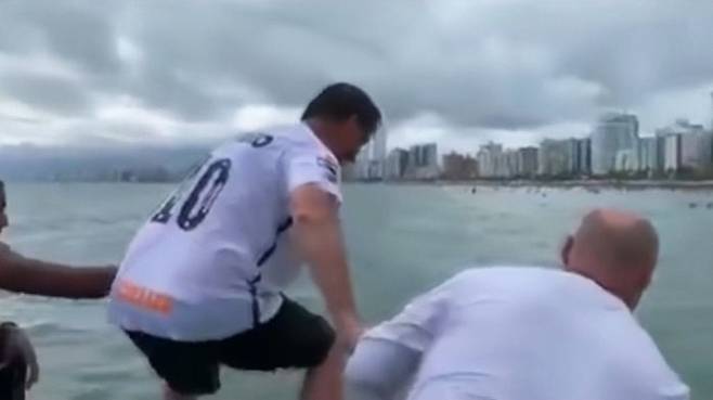 배 위에서 시민들을 향해서 손을 흔드는 남성, 이내 물속으로 뛰어드는데요, 자이르 보우소나루 브라질 대통령의 모습입니다.