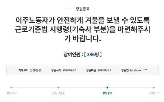 2017년 12월 부산의 한 공장 컨테이너 숙소. 이주노동자가 난방을 위해 전열 기구를 사용하다 화재로 숨진 사건. 그 해 여름 국가인권위원회는 건설업 이주노동자의 인권 증진을 위해 임시 주거시설의 주거환경 기준 마련 및 관리감독 강화를 권고하였고, 그 겨울 '이주노동자가 안전하게 겨울을 보낼 수 있도록 근로기준법 시행령(기숙사 부분)을 마련해 주시기 바랍니다'라는 국민청원에 386명의 시민들이 참여했다.