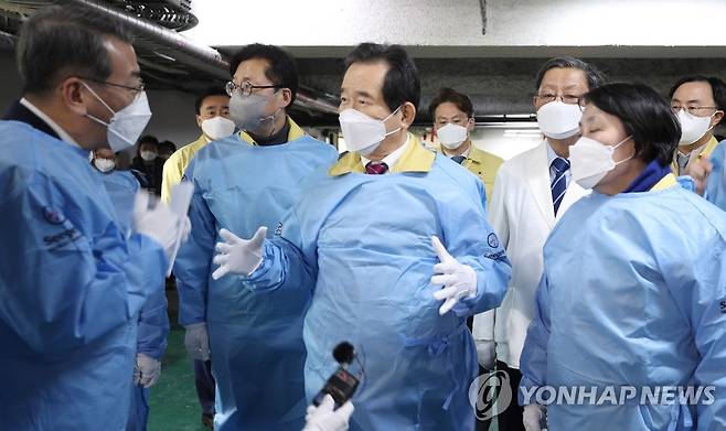 (서울=연합뉴스) 김승두 기자 = 정세균 국무총리가 6일 오후 서울 성동구 코로나19 검사수탁기관인 씨젠의료재단을 방문해 관계자들에게 당부의 말을 전하고 있다. 2021.1.6