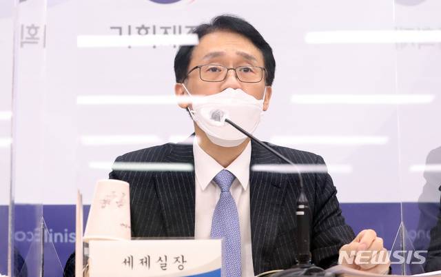 [세종=뉴시스]강종민 기자 = 임재현 기획재정부 세제실장이 지난 5일 정부세종청사에서 2020년 세법개정 후속 시행령 개정안을 설명하고 있다. 2021.01.06.