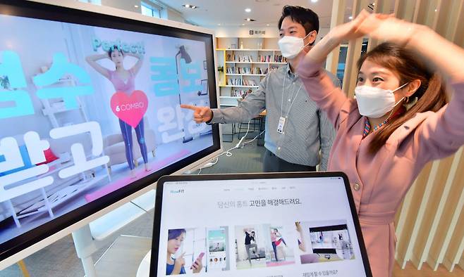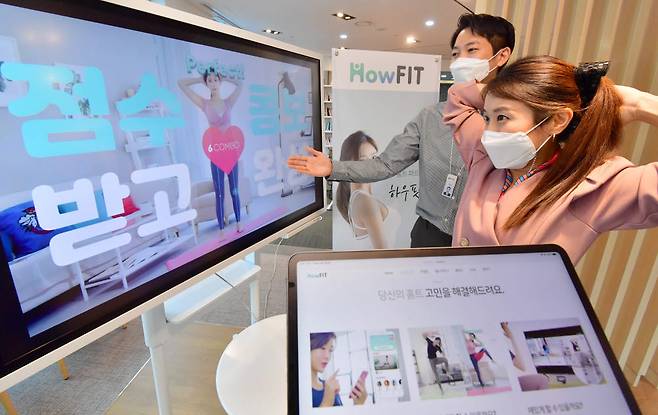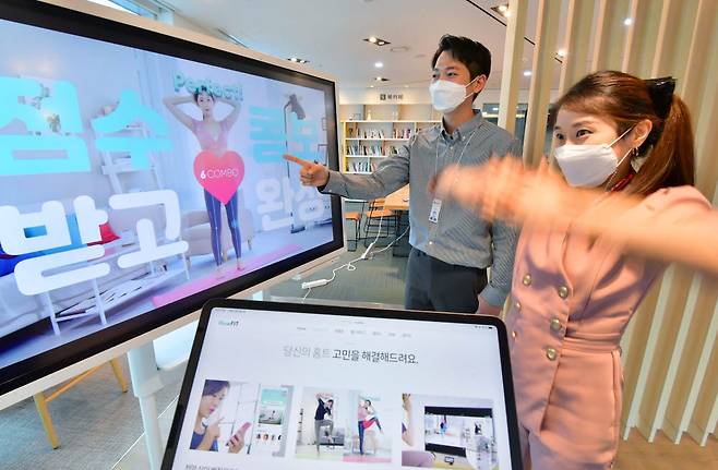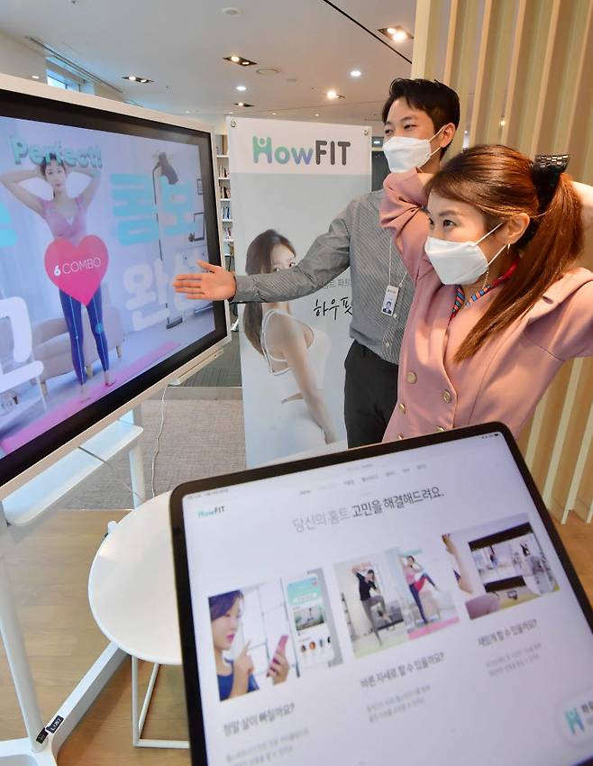 금융권이 정부의 디지털 대전환에 발맞춰 정보통신기술(ICT)과 융합한 디지털 헬스케어 분야 등에 관심을 보이고 있다. 6일 서울 을지로 신한L타워에서 신한생명 직원이 인공지능(AI) 홈트레이닝 서비스 '하우핏' 베타버전 테스트와 시연을 하고 있다. 하우핏은 2월 그랜드 오픈하며, 구독경제와 보험상품 할인 등에 적용될 예정이다.